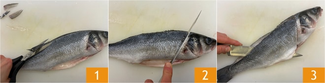 Para preparar la lubina al papillote, como primer paso dedícate a la limpieza de la lubina. Recorta las aletas 1 luego desescama bajo un chorro de agua corriente con la herramienta adecuada o con el dorso de un cuchillo. Haz un corte a lo largo del vientre, elimina las vísceras y enjuaga nuevamente. Realiza un corte diagonal, poco después de las branquias, que empiece desde el dorso y que se una con el corte hecho anteriormente en el vientre 2. Corta la cola y la parte dorsal del pescado siguiendo la columna vertebral 3, una vez obtenido el primer filete, procede de la misma manera con el segundo.