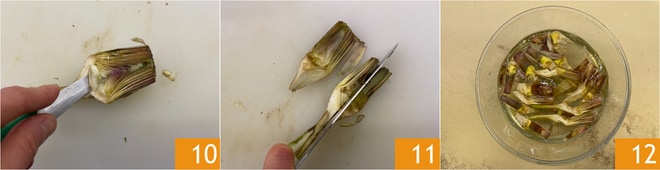 Divídelas a la mitad y elimina la pelusa interna 10, luego córtalas en cuartos 11. A medida que las limpias sumérgelas en agua acidulada 12.