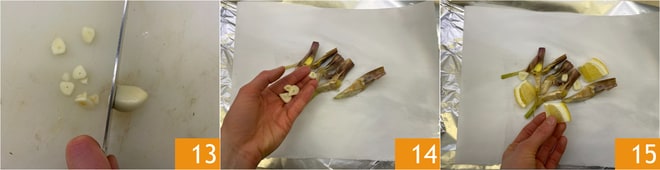 Corta el ajo en rodajas 13. Corta 4 hojas de papel de horno y colócalas sobre 4 hojas de papel de aluminio. Coloca en el centro las alcachofas, el ajo 14 y algunas rodajas de limón 15.