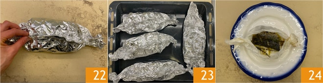 Cierra el papel de aluminio en forma de caramelo 22. Coloca los papillotes en una bandeja 23 y hornea en horno estático, precalentado, a 200°C durante 20-25 minutos. La lubina al papillote está lista para ser servida directamente en el papillote 24.