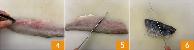 Elimina las posibles espinas e impurezas 4. Corta los filetes en rombos 5 luego haz incisiones en la piel 6. Reserva.
