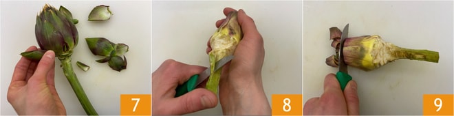 Ahora dedícate a la Cómo limpiar las alcachofas. Elimina las hojas externas y las más duras 7. Pela el tallo 8 luego elimina las puntas con un corte limpio 9.
