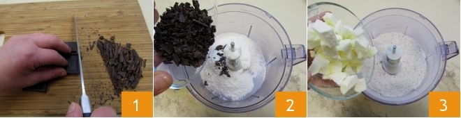 Para preparar las estrellas crujientes con chocolate y canela, empieza picando el chocolate negro 1, luego añádelo a la harina tamizada en el vaso de una batidora 2. Vierte también la mantequilla fría cortada en trozos 3;