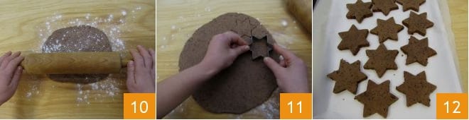 Pasado el tiempo necesario, estira el bloque sobre una superficie de trabajo ligeramente enharinada con un grosor de aproximadamente 1 cm 10. Con un cortador de galletas en forma de estrella, corta el disco de masa y saca las formas de las galletas 11: obtendrás alrededor de 26, puedes reamasar los recortes para terminar la masa. Colócalas en una bandeja forrada con papel de horno y ponlas en el frigorífico a endurecer durante 15 minutos.