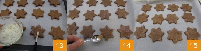 Después colócalas en una bandeja forrada con papel de horno y úntalas con la clara de huevo 13, luego espolvorea con azúcar aromatizado con canela en polvo 14 y hornea a 150° durante unos 12-15 minutos (130° durante 8-10 minutos si es horno con ventilador. Puedes cocer 1 o 2 de prueba para ajustar mejor los tiempos y la temperatura). Una vez cocidas, saca del horno las estrellitas crujientes con chocolate y canela 15 y déjalas enfriar completamente sobre una rejilla antes de servirlas!