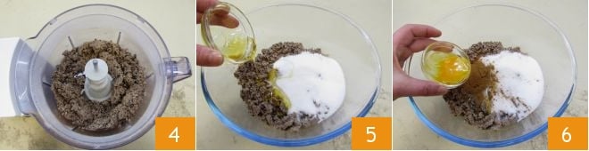 activa las cuchillas y crea una mezcla arenosa 4. Transfiérela a un bol y vierte el azúcar y la miel 5. Luego añade también la yema 6. Agrega también la canela en polvo y la ralladura de limón.
