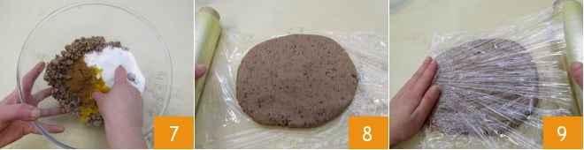 Trabaja todos los ingredientes rápidamente a mano para evitar calentar demasiado la masa 7, luego forma un bloque, aplástalo para darle una forma ovalada y envuélvelo en film transparente (8-9). Colócalo en el frigorífico durante al menos 30 minutos para que se endurezca.