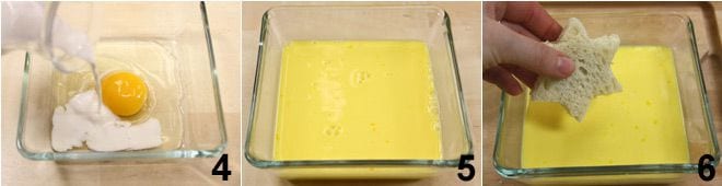 Toma un bol y bate el huevo con la leche (4-5). Pasa luego las estrellitas por la mezcla de huevos y leche 6.