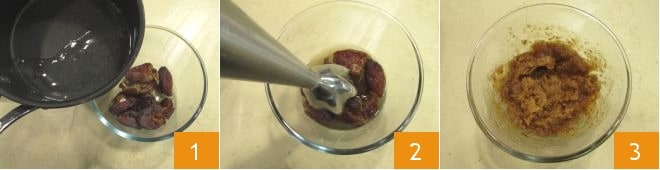 Para preparar el sticky toffee pudding, primero calienta el agua en un cazo. Pon los dátiles en un bol, vierte el agua caliente por encima 1 y déjalos en remojo durante unos 10 minutos. Pasado este tiempo, tritura los dátiles junto con el agua de remojo con una batidora de mano 2 hasta reducirlos a puré 3.