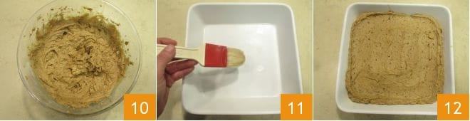 y continúa mezclando bien los ingredientes hasta obtener una masa homogénea 10. Engrasa un molde de 24x24 cm con una altura de 5 cm 11, vierte la masa dentro y alísala con una espátula 12. Hornea en el horno estático precalentado a 180° durante unos 50 minutos.