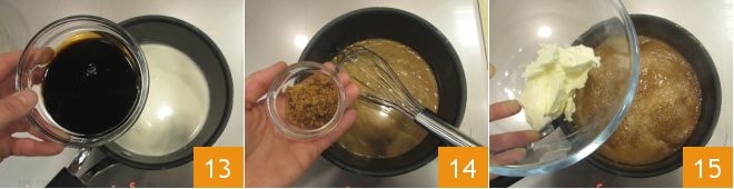 Mientras tanto, puedes preparar la salsa: pon la nata en un cazo, añade la melaza 13 y cocina a fuego lento mezclando bien con una varilla manual, luego agrega el azúcar moscovado 14 y continúa mezclando a fuego medio, hasta que hierva. En este punto, añade también la mantequilla 15 y mezcla durante aproximadamente 1 minuto para que se espese ligeramente, luego retírala del fuego.