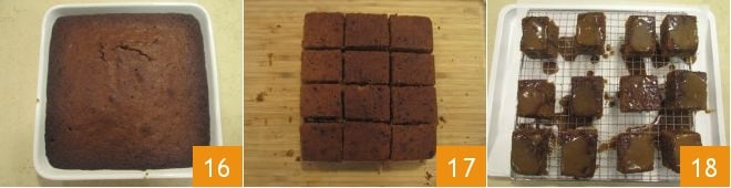 Transcurrido el tiempo de cocción del pastel, sácalo del horno y déjalo templar dentro del molde 16, después desmóldalo sobre una tabla de cortar y córtalo en 12 cubos del mismo tamaño 17. Transfiere los cubos a una rejilla y riégalos con una dosis generosa de salsa, para que sea absorbida por la masa 18.
