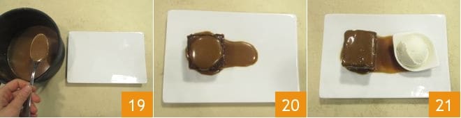 En este punto, distribuye parte de la salsa restante en los platos de servir 19, coloca los cubos encima y rocíalos nuevamente con la salsa 20: ¡tu sticky toffee pudding está listo para ser servido con una fresca bola de helado de nata 21!