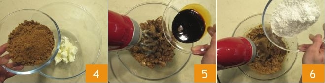 Pasa a la preparación de la masa: en un bol, mezcla el azúcar moscovado con la mantequilla ablandada 4 y trabaja la mezcla con una batidora eléctrica. Manteniendo la batidora en acción, añade la melaza 5, la harina 6,