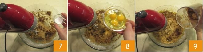la levadura 7 y los huevos, uno a uno, mientras continúas trabajando la masa con la batidora eléctrica 8. Por último, añade también el puré de dátiles 9
