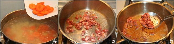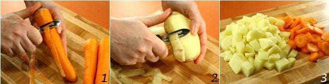 Pela las zanahorias 1 y las patatas 2; corta las patatas en trozos y las zanahorias en rodajas 3, luego hiérvelas en agua con sal 4.