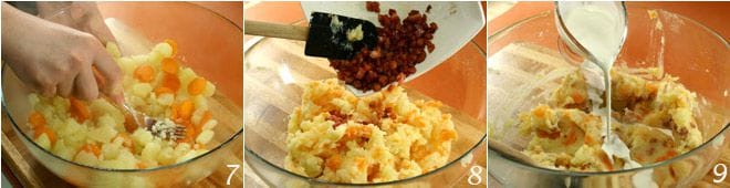 Cuando las verduras estén listas para ser aplastadas, escúrrelas bien y ponlas en un bol; con la ayuda de un tenedor aplástalas 7 hasta reducirlas a puré. Añade la mantequilla, mezcla y luego agrega la panceta crujiente 8, añade la nuez moscada rallada, la pimienta y por último, incorpora la nata 9; después de mezclar todos los ingredientes, sirve el stoemp de zanahorias inmediatamente.