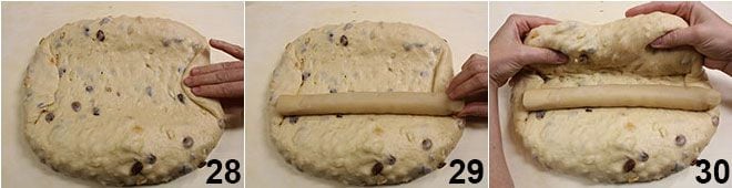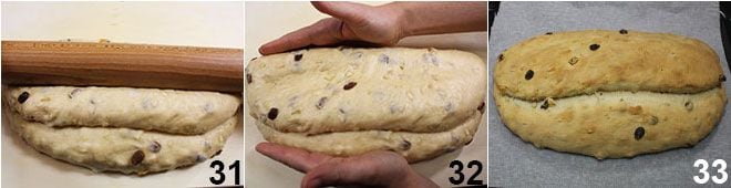 presiona con el rodillo en el centro, para sellar bien y conferir la clásica forma al stollen 31. Moldea un poco con las manos para dar al stollen una forma regular 32 y colócalo en una bandeja forrada con papel de horno. Hornea en horno estático ya caliente a 180° durante aproximadamente 60-70 minutos, hasta que el stollen esté dorado 33.