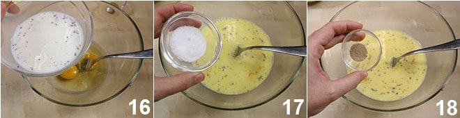 En este punto, en un bol, bate los dos huevos y añade la leche en la que habías puesto en infusión la vainilla (eliminando previamente la vaina) 16. Añade la sal y el cardamomo 18 y finalmente