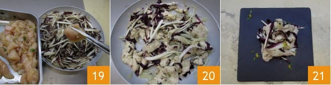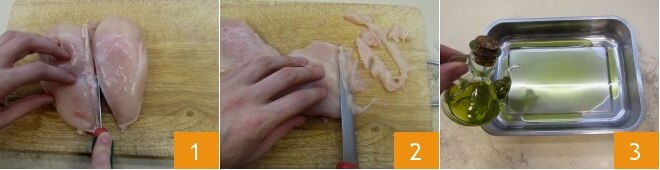 Para preparar las tiras de pollo con achicoria, tomad la pechuga de pollo, cortadla por la mitad 1 eliminando las partes grasas y el hueso central; con un cuchillo cortad en tiras bastante finas 2. En una bandeja verted el aceite 3,