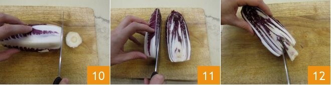 Lavad la achicoria con abundante agua fresca corriente; eliminad la base 10, cortadla por la mitad 11, quitad la parte dura 12 y