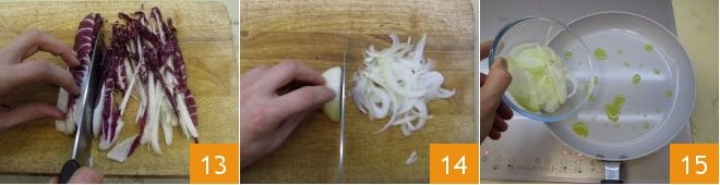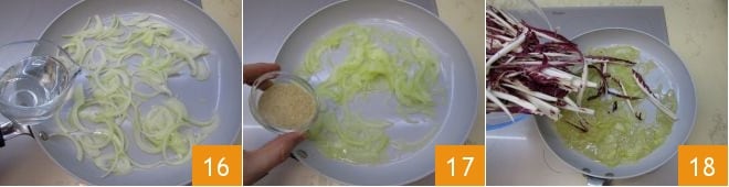 Añadid el agua 16, el azúcar moreno 17, y dejad cocer otros 5 minutos. Añadid también la achicoria cortada en tiras y dejad cocer durante 2 minutos, subiendo la llama 18.