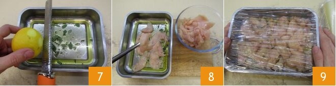 Rallad la cáscara de un limón no tratado 7 y luego distribuid las tiras de pollo una junto a la otra en la bandeja para que el marinado se distribuya de manera uniforme 8; cubrid con film transparente y colocad en el frigorífico al menos 2 horas 9.