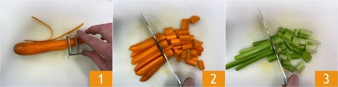 Para preparar la stracciatella en caldo vegetal lo primero que hay que hacer es preparar el caldo. Lavad bien las verduras y pelad las zanahorias 1. Luego cortadlas en trozos 2 y haced lo mismo con el apio 3.