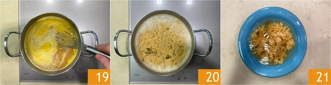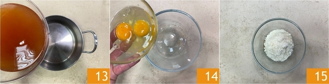Vertedlo de nuevo en la olla 13 y mantenedlo caliente. Mientras tanto en un bol verted los huevos 14 y añadid el parmesano 15.