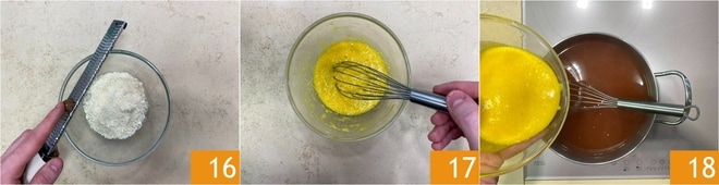 Rallad también nuez moscada 16 y mezclad con una varilla. Verted la mezcla de huevos poco a poco en el caldo en ebullición, mezclando con la varilla 18.