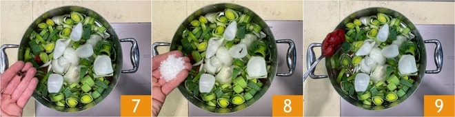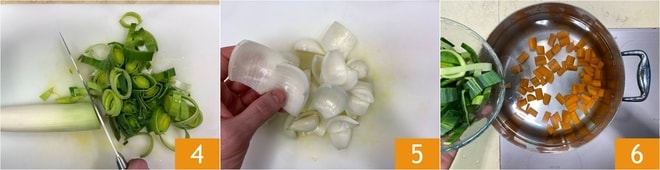 Cortad en rodajas también el puerro eliminando la parte con las raíces 4 y dividid en capas las cebollas; luego separad las distintas capas 5. En una olla verted unos 2 litros de agua fría y añadid las verduras 6.