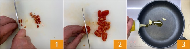 Para preparar la stroncatura calabresa con tomatitos y anchoas, lo primero que tenéis que hacer es cortar el chile en rodajas 1 y los tomatitos en cuartos 2. En una sartén verter un chorrito de aceite y añadir 2 dientes de ajo sin pelar, machacados 3.