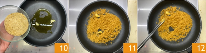 Mientras tanto, en otra olla, verter un chorrito de aceite y añadir los otros 2 dientes de ajo, siempre sin pelar, machacados. Sofreír durante unos minutos, luego añadir el pan rallado 10, cocinar hasta que esté dorado 11, luego eliminar el ajo 12 y reservar.