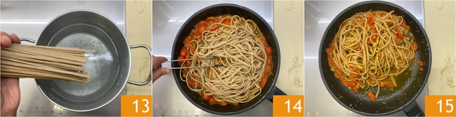 Cocer la stroncatura en abundante agua hirviendo con sal 13, escurrirla, transferirla a la sartén con el condimento 14 y mezclar 15. Si es necesario, se puede añadir agua de cocción de la pasta.