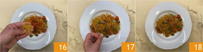 Emplatar, agregar el pan rallado 16, completar con filetes de anchoas en aceite, cortados en rombos de aproximadamente 2 cm y albahaca fresca 17. Vuestra stroncatura calabresa con tomatitos y anchoas está lista para ser servida 18.