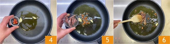 Agregar el chile 4 y sofreír durante unos minutos. Añadir las anchoas 5 y dejarlas derretir a fuego lento 6.