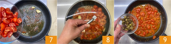 Agregar los tomatitos 7, cubrir con una tapa 8, y cocinar a fuego medio durante 10 minutos. Luego añadir las aceitunas taggiasca 9, albahaca fresca, y cocinar durante otros 10 minutos.