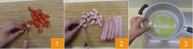 Para preparar los strozzapreti con pez espada, tomates cherry y alcaparras, comenzad desalando las alcaparras bajo agua corriente, enjuagándolas varias veces cuidadosamente. Luego, reservadlas. Después tomad los tomates cherry y cortad cada uno en 4 partes 1. Pasad a ocuparos del pez espada: quitadle la piel, cortadlo en tiras de aproximadamente 2 cm de ancho, luego reducidlo a cubos 2: reservad los tomates cherry y el pez espada. Ahora rociad una sartén antiadherente con un poco de aceite y dejad dorar el ajo pelado y dejado entero (así será más fácil luego retirarlo) 3. Dejad que se dore durante unos 2-3 minutos a fuego moderado.