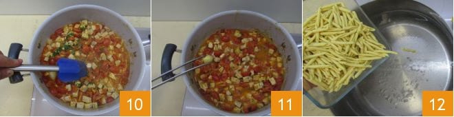 Mezclad los ingredientes para amalgamar los sabores 10. Después quitad el ajo 11 y apagad el fuego. Mientras tanto, coced la pasta en abundante agua hirviendo, con sal al gusto 12.