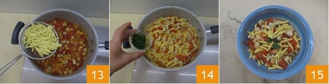 Cuando esté cocida, escurridla y vertedla directamente en la sartén con el condimento de pez y tomates cherry 13. Espolvoread con el perejil restante (siempre finamente picado) 14 y mezclad los ingredientes, luego emplatad vuestros strozzapreti con pez espada, tomates cherry y alcaparras 15 y servidlos aún calientes.