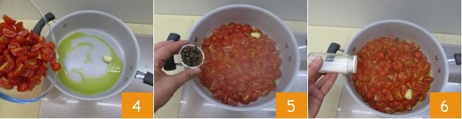 Agregad los tomates cherry 4 y las alcaparras desalada 5, luego ajustad de sal 6 y pimienta. Dejad cocinar así durante unos 10 minutos a fuego lento.