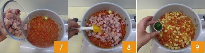 En este punto, añadid también el pez espada 7 y mezclad los ingredientes 8 para favorecer una cocción uniforme. Dejad cocinar a fuego lento durante otros 5 minutos. Ahora verted la mitad del perejil finamente picado 9.
