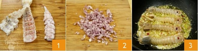 Para preparar los strozzapreti con salsa de galeras, comienza lavando muy bien las galeras, luego conserva las 4 más grandes y extrae la pulpa de las otras. Para facilitar la operación, es recomendable sumergir las galeras durante algunos segundos en agua hirviendo, de este modo será más fácil extraer la pulpa 1. Luego pica la chalota 2 y sofreírla en una cacerola con el aceite a fuego lento junto con algunos trozos de guindilla.