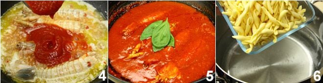 Mezcla con delicadeza y deja que la salsa se espese teniendo cuidado de no romper las galeras enteras. Finalmente, agrega sal y algunas hojas de albahaca 5. Cocina los strozzapreti en abundante agua con sal 6, escúrrelos y saltéalos en la salsa de galeras unos instantes.