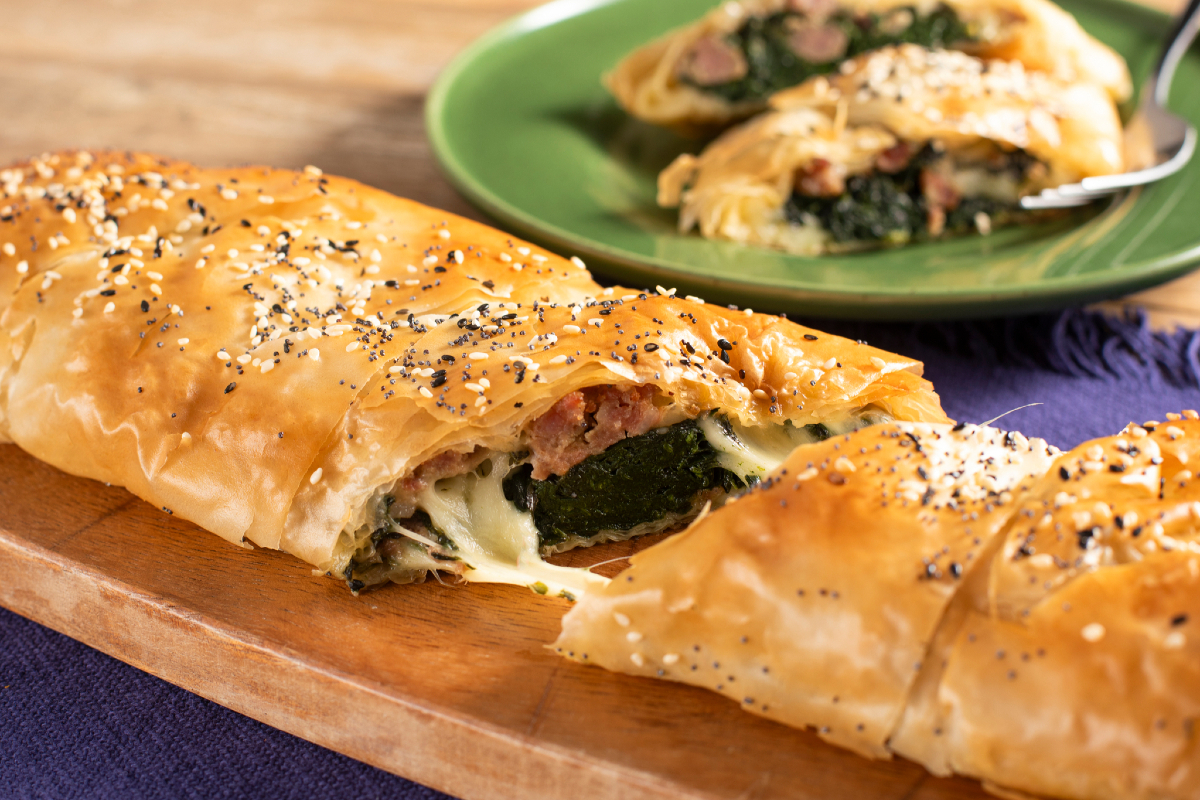 Déjate envolver por los sabores intensos del strudel de masa filo con salchicha y espinacas, un sabroso rústico para servir como aperitivo