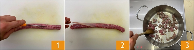 Para preparar el strudel de masa filo con salchicha y espinacas, primero haz un corte longitudinal en la salchicha 1 y quítale la tripa 1. En una sartén calienta un poco de aceite y añade la salchicha desmenuzada 3.