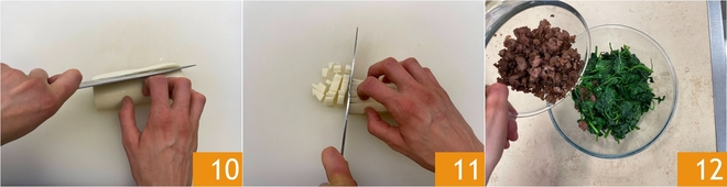 Corta el queso de pasta hilada primero en palitos 10 y luego en cubitos 11. En un bol une las espinacas y la salchicha 12.