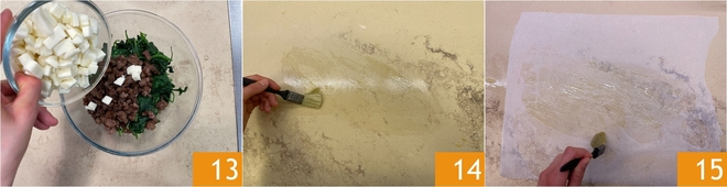 Completa el relleno con los cubitos de queso 13 y mezcla. Unta con aceite la superficie de trabajo 14, luego extiende una hoja de papel de horno de modo que quede bien adherida. Unta también la hoja de papel de horno 15.