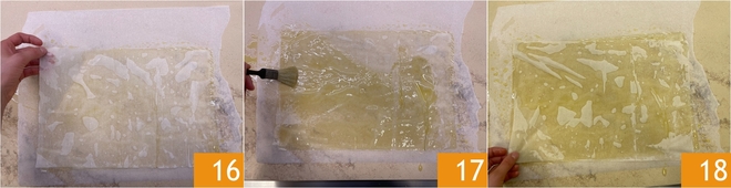 Coloca encima la primera hoja de masa filo 16 y píntala con aceite 17, luego añade una segunda hoja de masa filo 18 y haz que quede bien pegada.