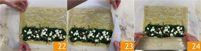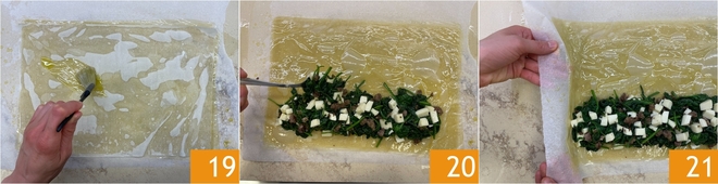 Continúa así con las 6 hojas de masa filo. Pinta la última capa con aceite 19 y rellena la mitad inferior con el relleno, cuidando de dejar un borde libre 20. Ahora cierra la masa: levanta el papel de horno para doblar ligeramente el lado corto 21.